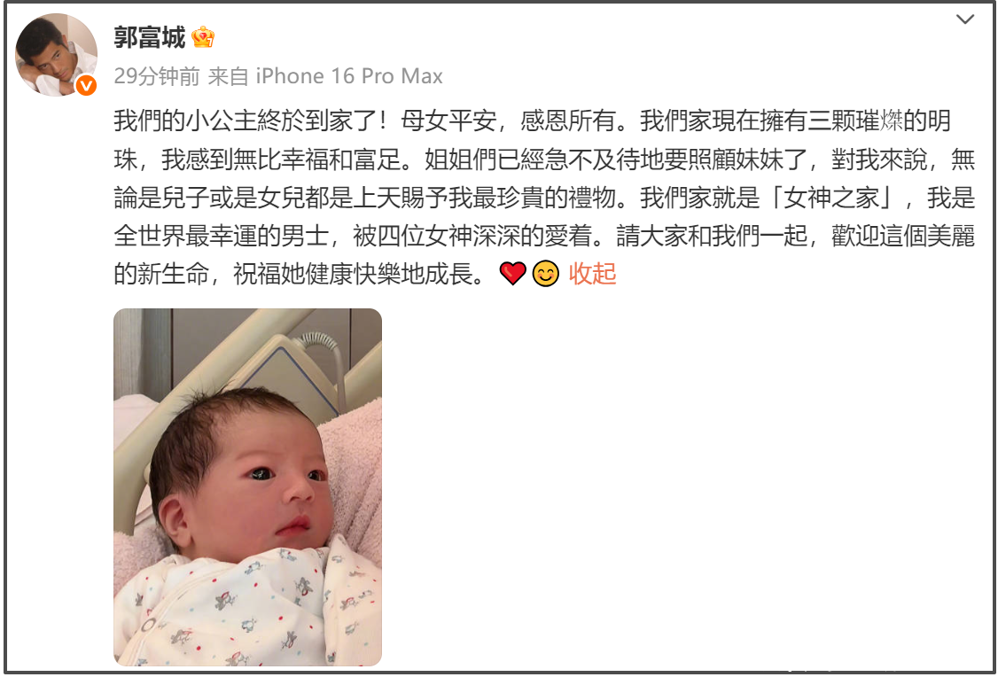 郭富城发微博分享了三胎正面照,并透露三胎是女儿,目前母女平安,郭富城特别强调:“对我来说,无论是儿子或是女儿都是上天赐予我最珍贵的礼物,我们家就是女神之家。”还欢呼自己是全世界最幸运的男士,被四位女神深深爱着。