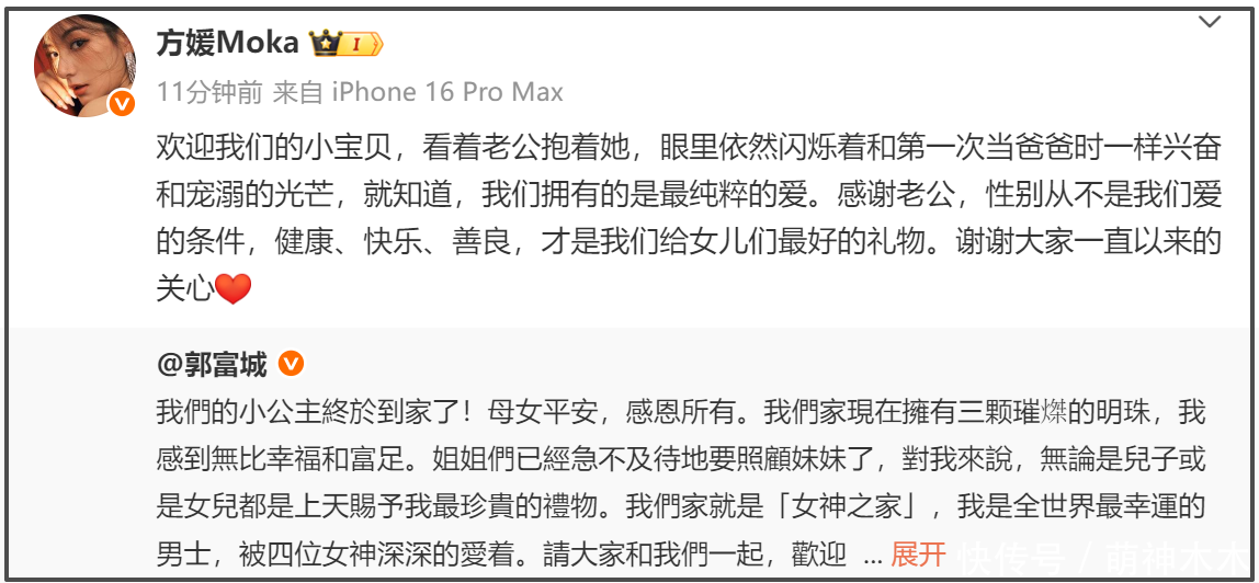 方媛也特别强调:“感谢老公,性别从不是我们爱的条件,健康、快乐、善良,才是我们给女儿们最好的礼物。谢谢大家一直以来的关心。”